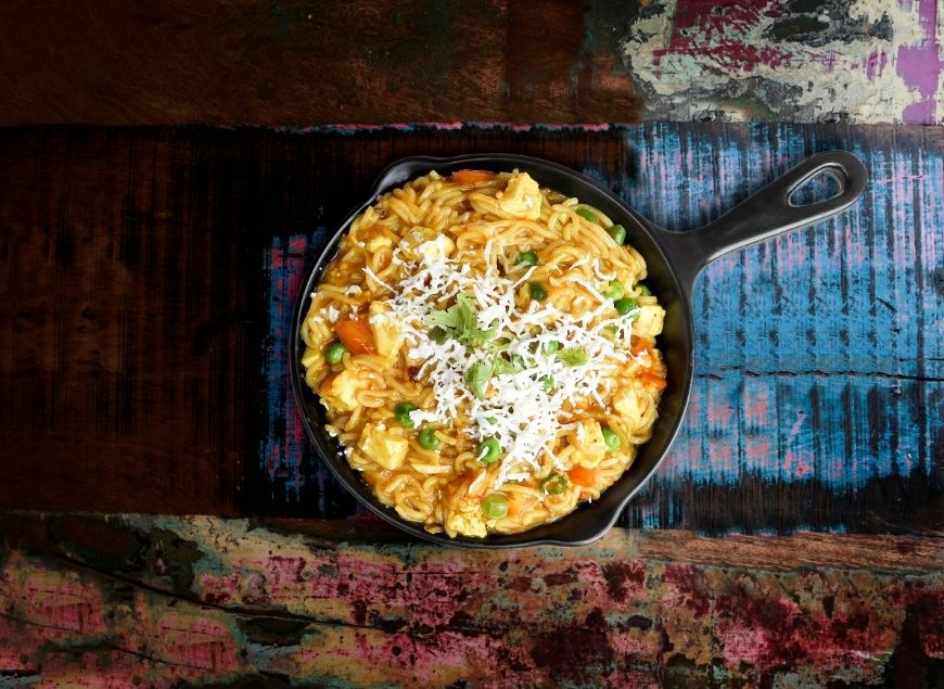 • Add the powdered masalas along with maggi masala and cook well, add water and maggi noodles, cook until maggi is 3/4th cooked